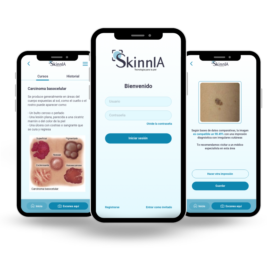 Por otro lado, cuenta con cursos donde los usuarios pueden aprender y evaluar sus conocimientos sobre la piel y sus cuidados. SkinnIA es una empresa de base tecnológica que busca incrementar la tasa de supervivencia de pacientes con cáncer y otras afectaciones de piel, poniendo a disposición del público una herramienta de impresión diagnóstica temprana basada en tecnología de inteligencia artificial.